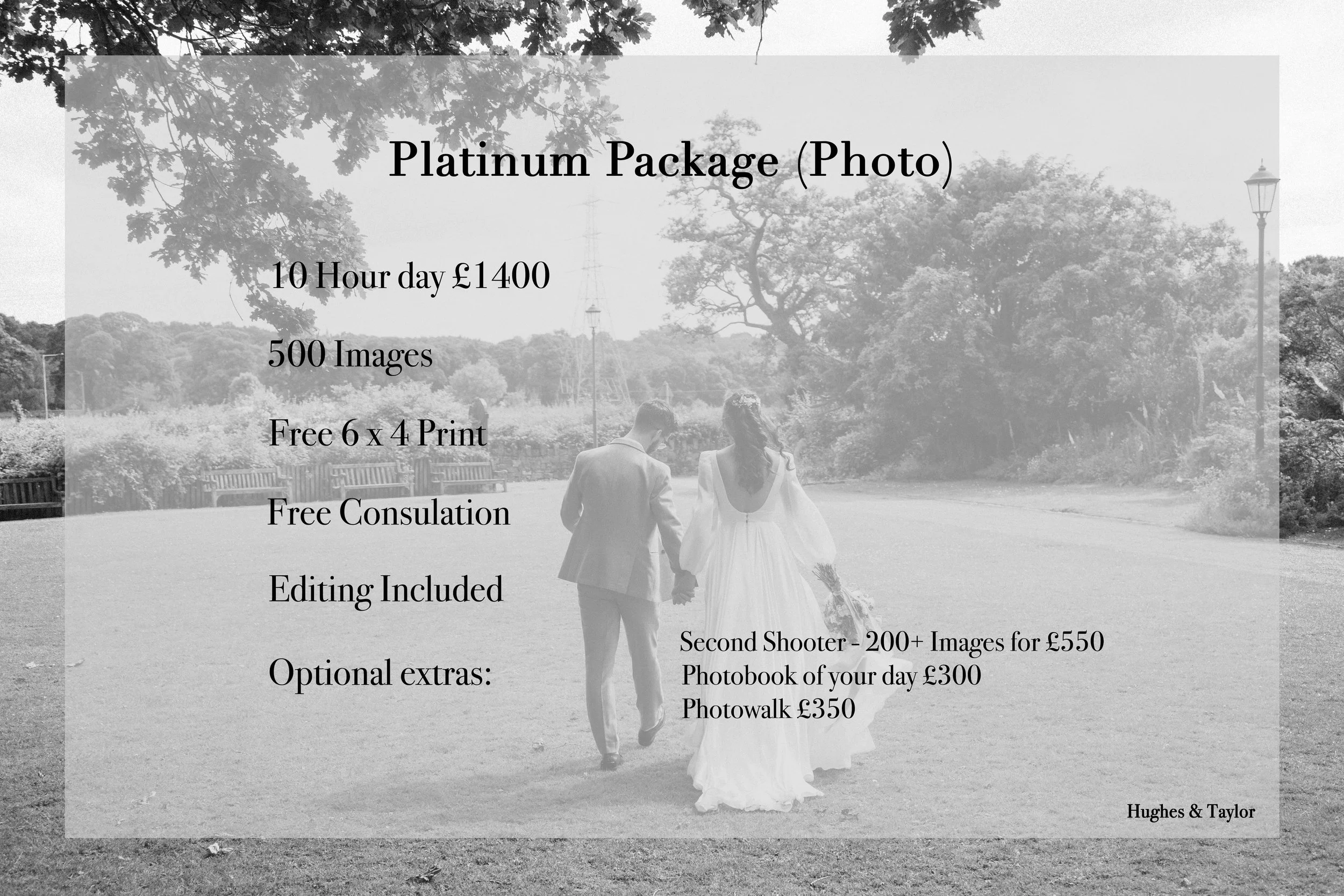 Photography - 10 hour day - 500 images - Second shooter (200 extra images, 6 hours coverage, +£550) - example timings (Hair and make-up to Ceremony) (Ceremony to Speeches) - Free Print 6 x 4 - Free Consultation - Editing included - £1400